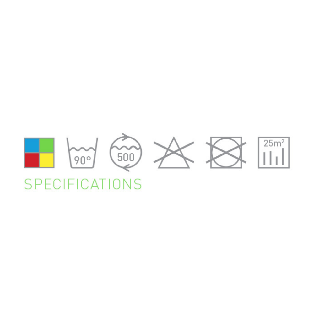 Can be washed to 90°C with a 500 lifecycle. No Bleach and No Tumble Dry.