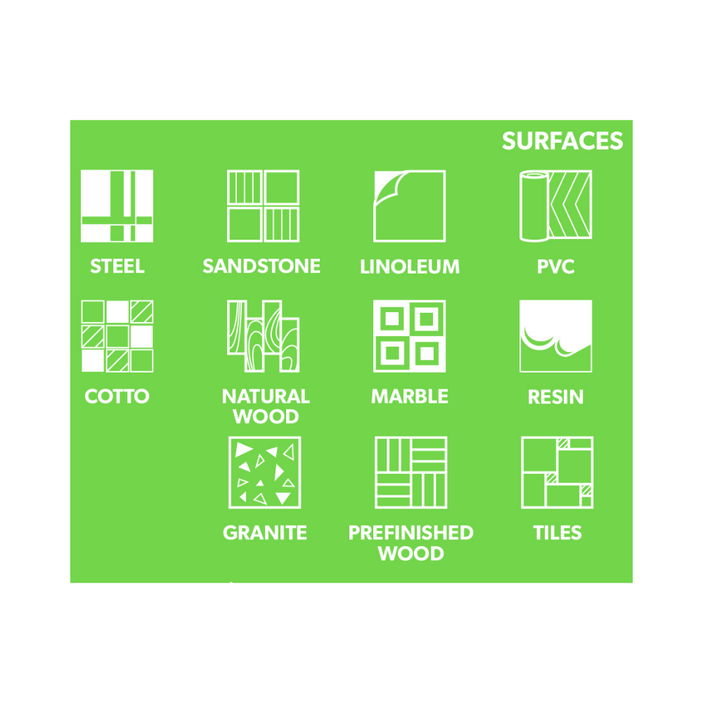 Ideal for surfaces of Cotto, Granite, Linoleum, Marble, Natural wood, Prefinished Wood, Pvc, Resin, Sandstone, Steel, Tiles.