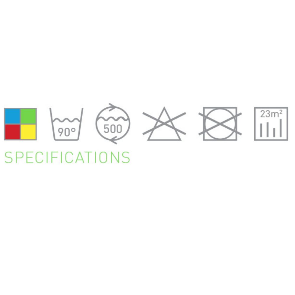 Can be washed to 90°C with a 500 lifecycle. No Bleach and No Tumble Dry.