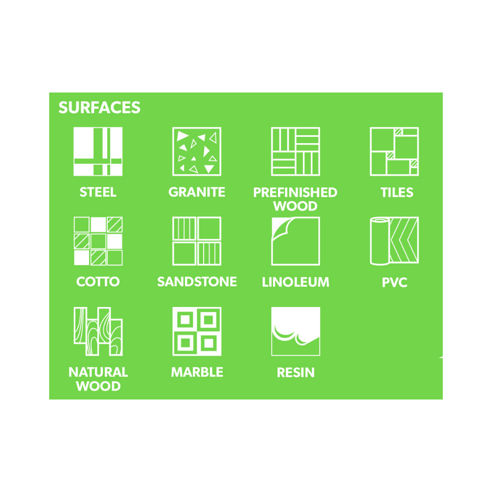 Για επιφάνειες όπως, Αντιολισθητικό Πλακάκι, Γρανίτη, Μουσαμά, Μάρμαρο, Φυσικό Ξύλο, Pre-finished σκληρό Ξύλο, Pvc, Ρητίνη, Ψαμμίτη, Ατσάλι, Πλακάκι.