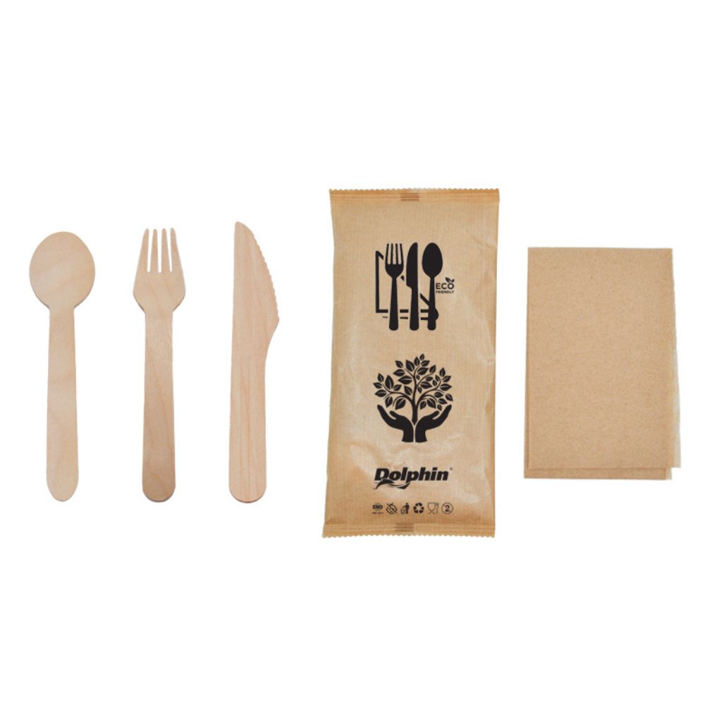 Ξύλινο σετ Πιρούνι,Κουτάλι,Μαχαίρι με χαρτοπετσέτα Dolphin, οικολογικό και ανθεκτικό. Ιδανικό για takeaway, εστιατόρια και catering.